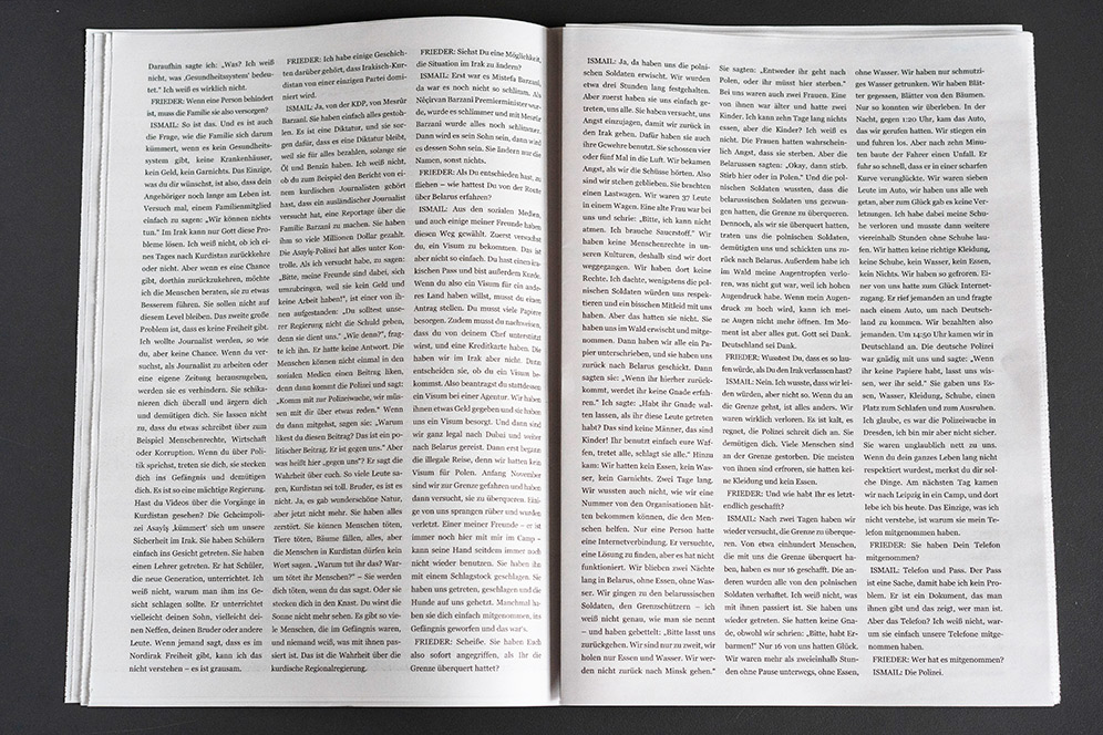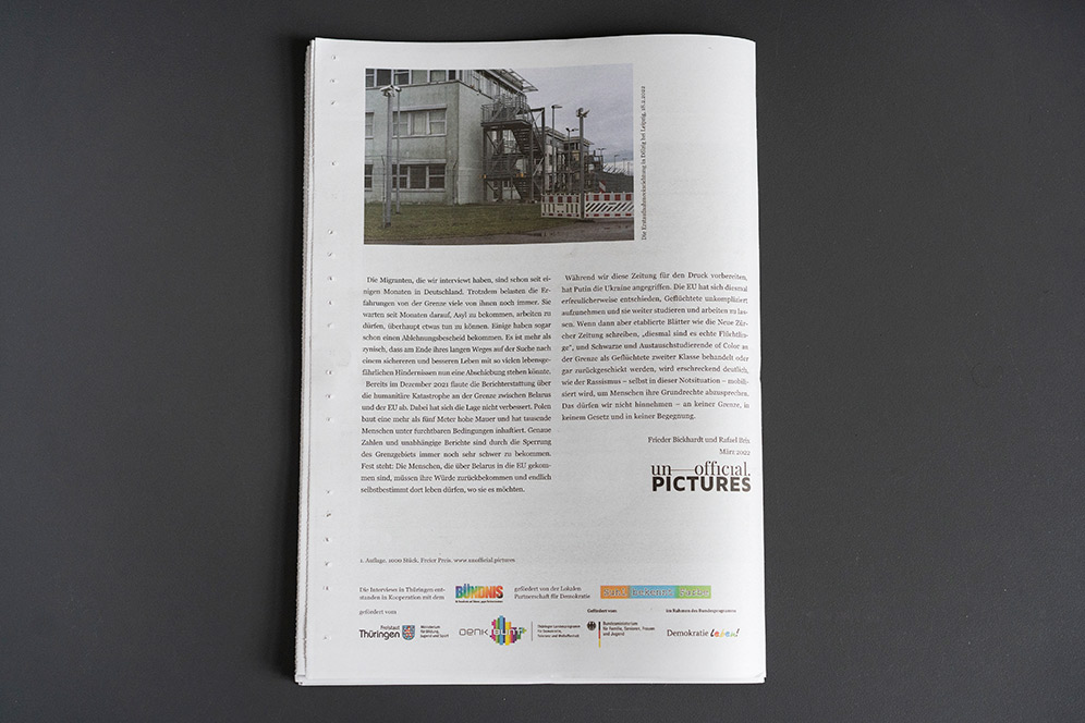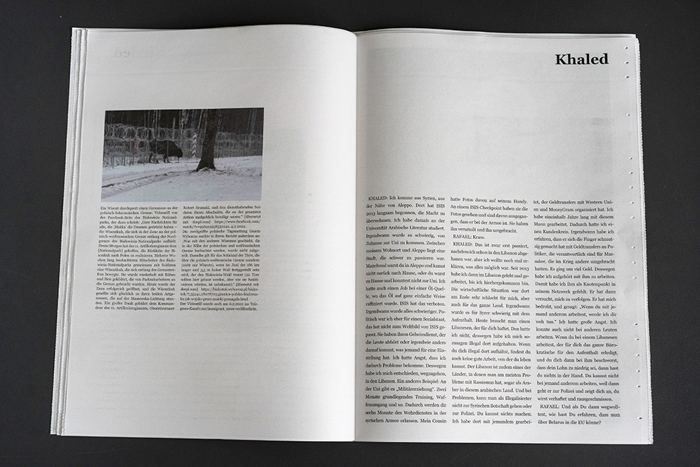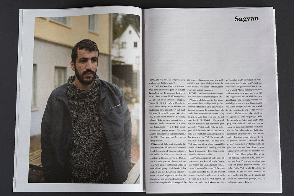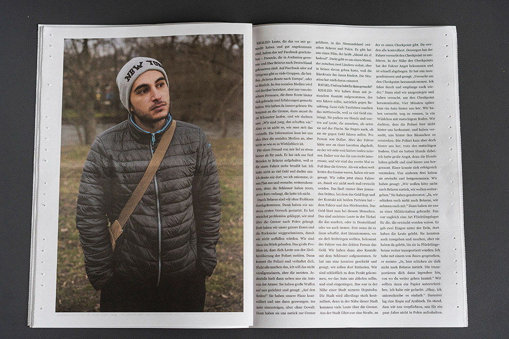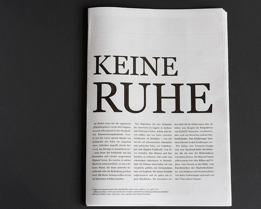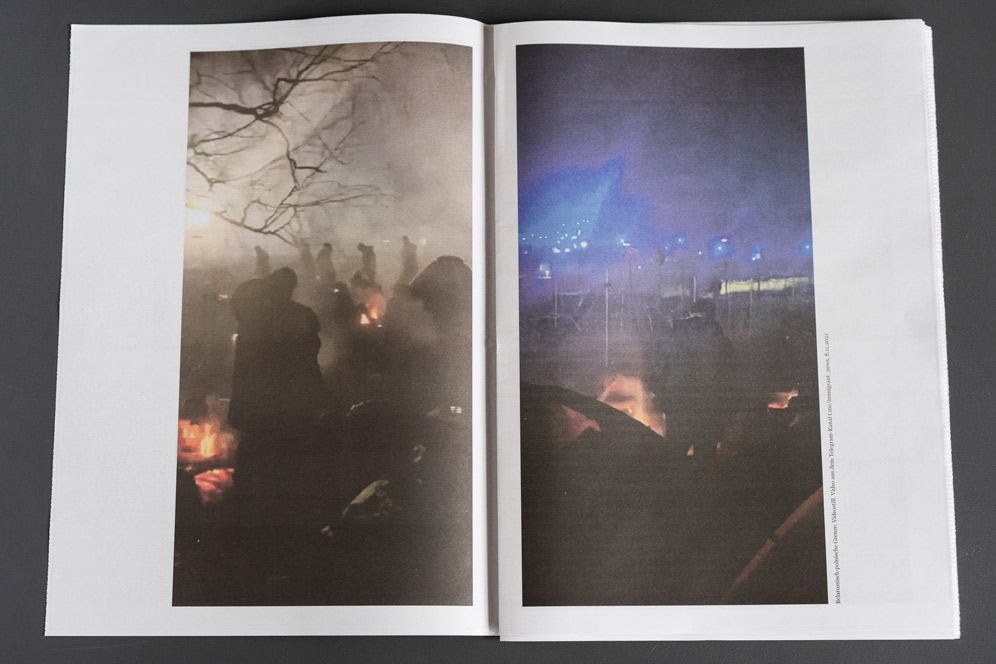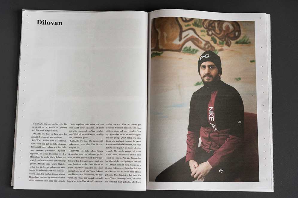In the fall of 2021, the so-called “refugee crisis” on the EU’s eastern border was still very much in the news. Commission President Ursula von der Leyen spoke of solidarity with Poland in the face of a “hybrid attack [by Belarus] to destabilize Europe” – not a word of solidarity with the freezing migrants exposed to violence. They are dehumanized in such rhetoric, turned into a diffuse mass that is then either pitied or seen as a threat. With this newspaper we want to make them visible as human beings.