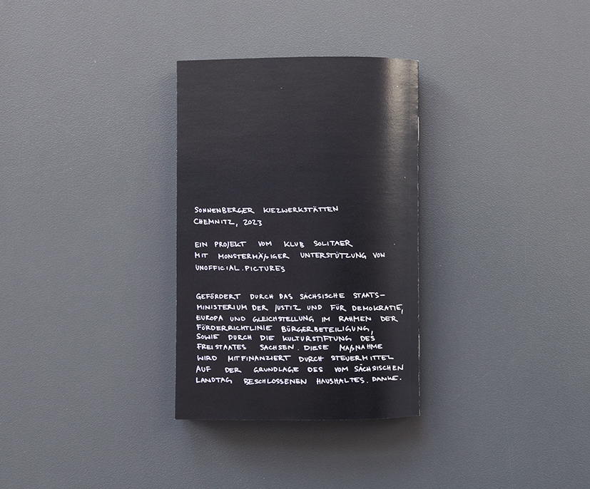 As part of the neighborhood workshops 2023 in Chemnitz-Sonnenberg, organized by Klub Solitaer, unofficial.pictures created a collage and a zine workshop. “übelst supercoole MONSTER und noch ganz viel anderes, aufregendes, superschönes VOM größten, supercoolen, heftigen SONNENBERG [sun mountain] der Welt, Brudi Jippi!” is the wonderfully wild product of the neighborhood workshops and the zine workshop. Many thanks to Klub Solitaer for the great collaboration!