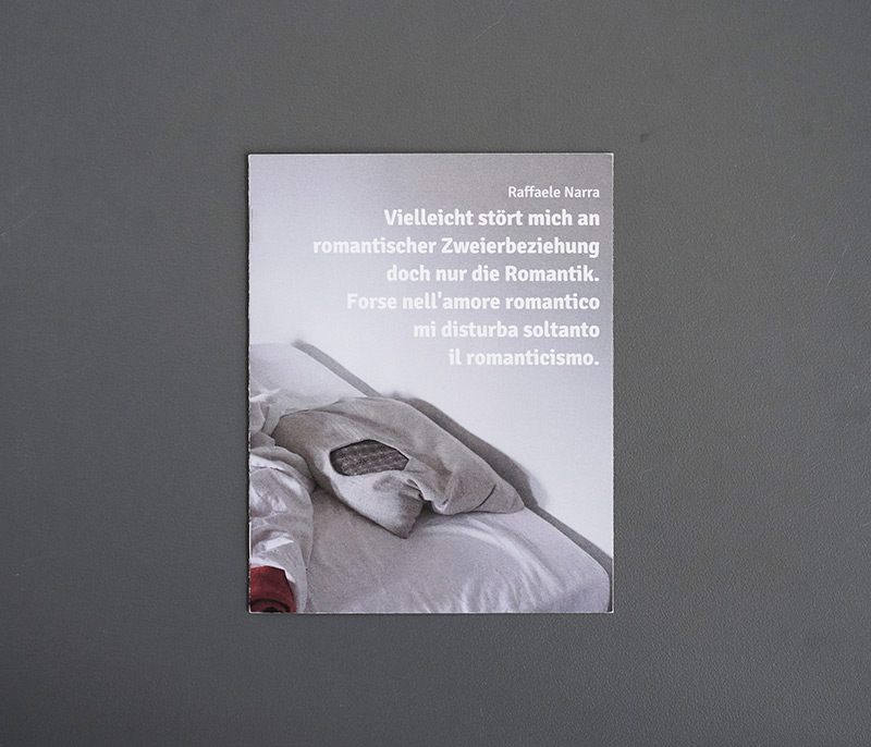 Raffaele Narra – Vielleicht stört mich an romantischer Zweierbeziehung doch nur die Romantik. Forse nell’amore romantico mi disturba soltanto il romanticism.
