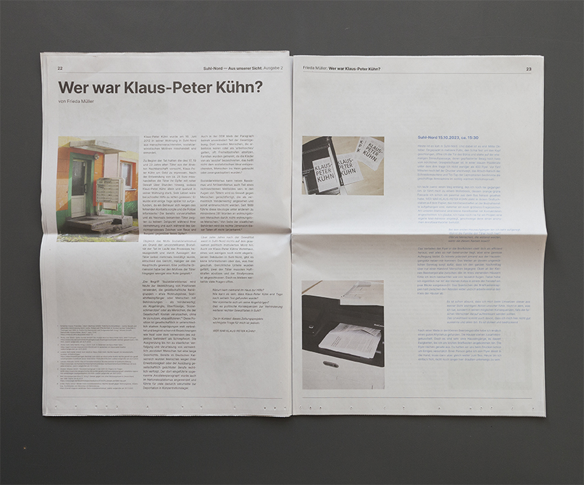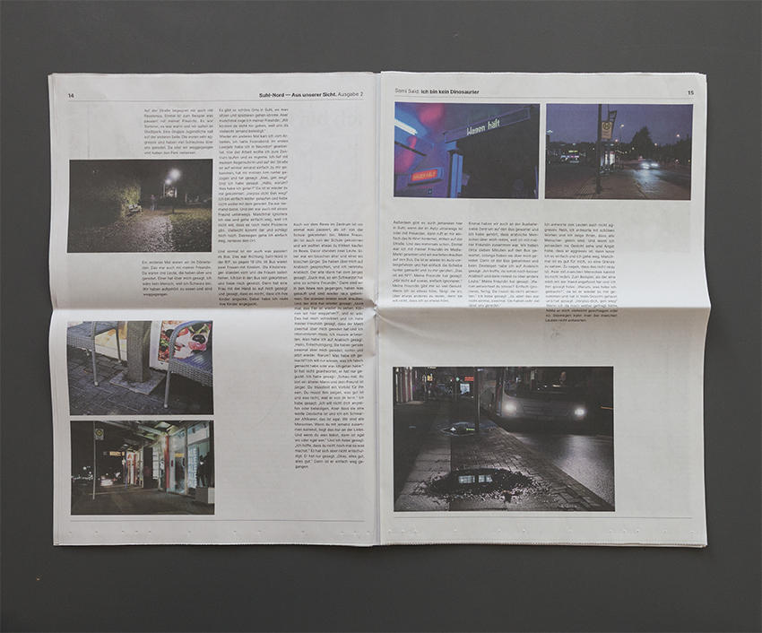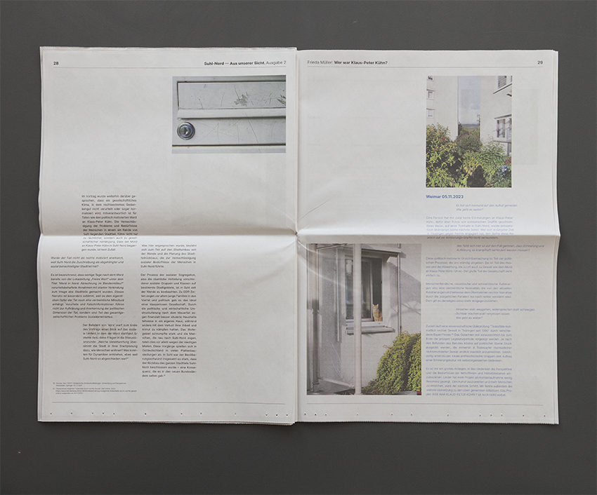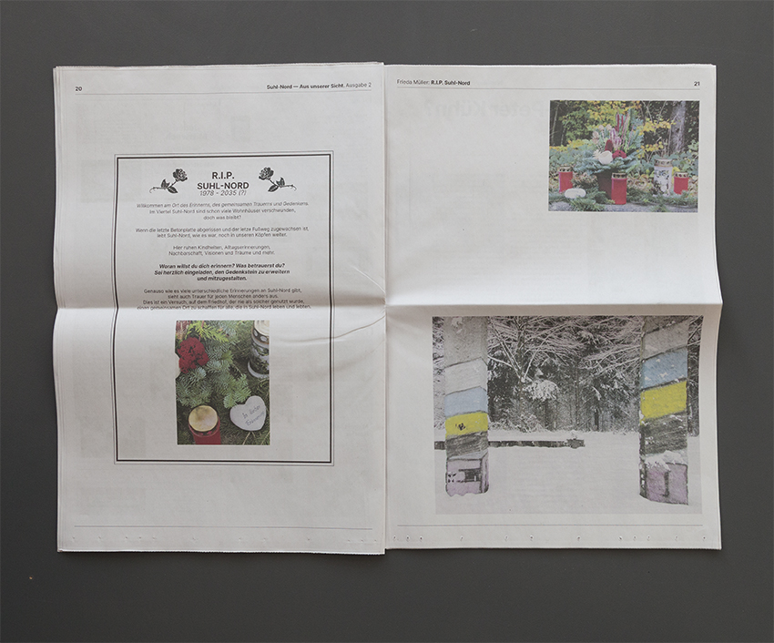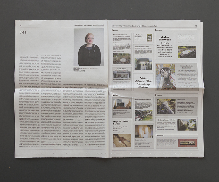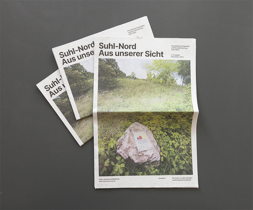About one year after the first photo-text newspaper ‘Suhl-Nord - From our point of view’ the second edition has now been produced in a workshop in autumn and winter. Under the guidance of Luisa Bäde and Rafael Brix, four people who have either lived, currently live, work or are interested in Suhl-Nord have pursued their very personal perspectives and interests and brought them together in pictures and text on 40 pages.
