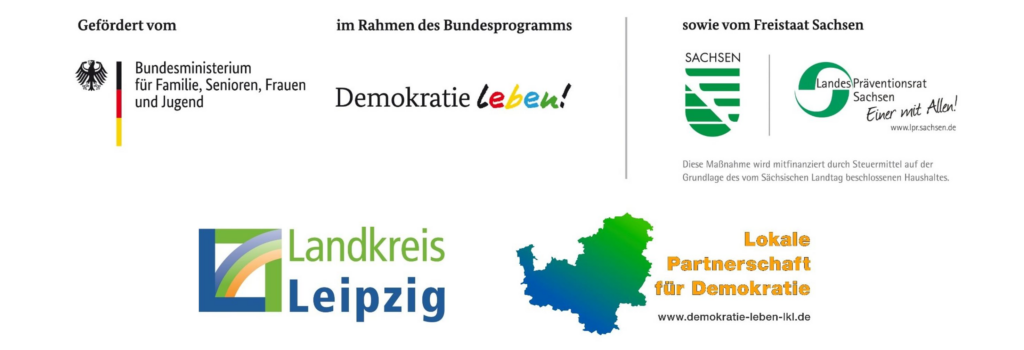Gefördert im Rahmen der Lokalen Partnerschaft für Demokratie im Landkreis Leipzig durch das Bundesprogramm Demokratie leben!, den Landespräventionsrat Sachsen und den Landkreis Leipzig. “Die Veröffentlichungen stellen keine Meinungsäußerung des BMFSFJ bzw. des BAFzA dar. Für inhalitche Aussagen trägt der Autor bzw. die Autoren die Verantwortung.