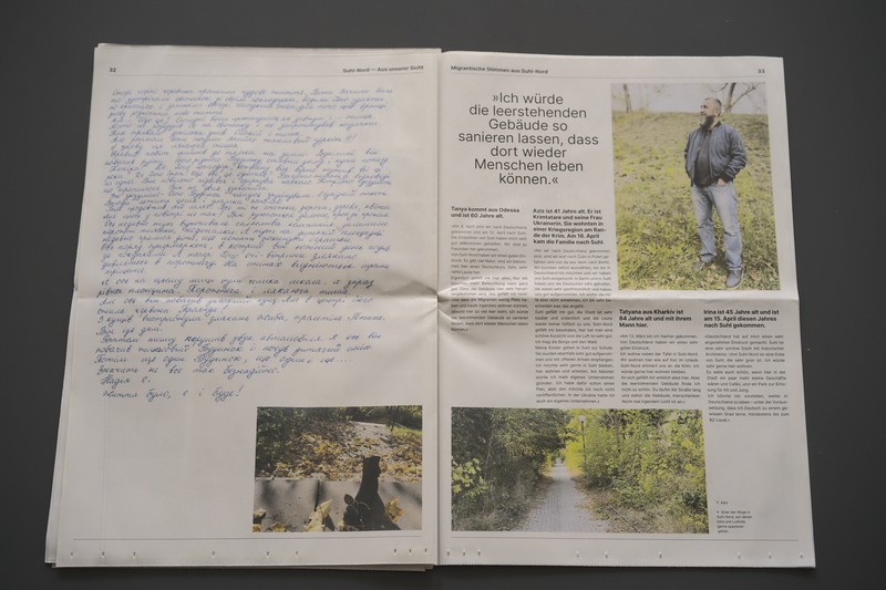 Die Zeitung sollte vor allem Perspektiven von Menschen aus Suhl-Nord eine Plattform bieten. Deswegen luden wir zu einem Workshop ein. Wir fanden motivierte Teilnehmer*innen, die hier gewohnt haben, noch wohnen, lernen oder arbeiten. Gemeinsam entwickelten wir aus verschiedenen Ideen die Themen unserer Zeitung. Am Ende war dabei am wichtigsten, was uns allen am meisten unter den Nägeln brannte. Deswegen hat diese Zeitung keinen Anspruch, Suhl-Nord vollständig, aus allen Perspektiven abzubilden. Sie zeigt, womit wir uns an den vier Wochenenden und dazwischen beschäftigen wollten. Was wir geschafft haben. Was wir gerne untersucht und entdeckt haben. Sicher werden Sie Aspekte vermissen oder zu manchen Positionen eine andere Sicht haben. Wir möchten Sie trotzdem einladen auf eine Rundreise in Text und Bild.