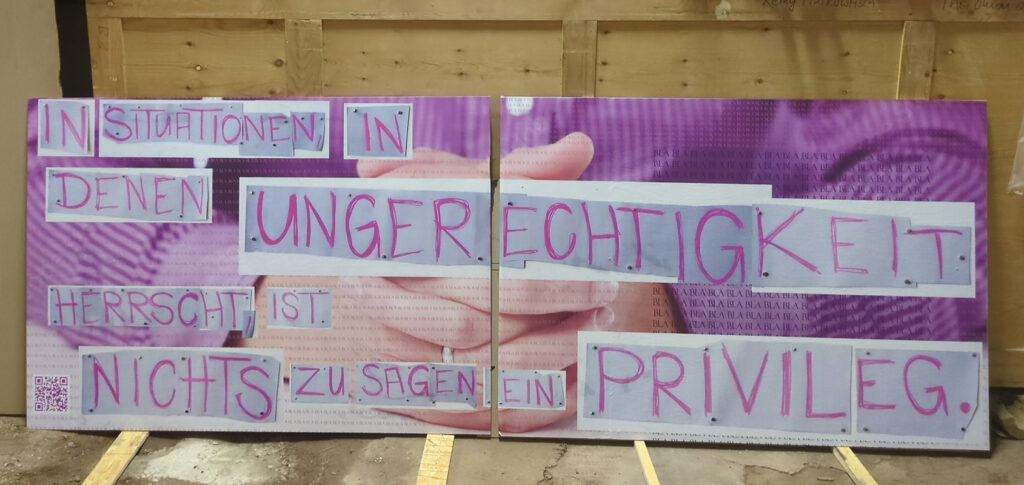 An vier Wochenenden haben wir uns mit der politischen Lage in Deutschland ausseinandergesetzt. Die ersten Wochenenden haben wir uns getroffen und uns als Gruppe zusammen gefunden. Wer sind wir? Aus welchen Perspektiven reden wir? Wir haben Texte gelesen, diskutiert und haben einen Weg gefunden unsere verschiedenen Perspektiven zusammen zu bringen. Die letzten Wochenenden haben wir unsere Plakat Ideen umgesetzt. Die Idee war es an drei verschiedenen Standorten drei Perspektiven Raum zu geben. Die daraus entstandenen Plakate findet ihr hier.