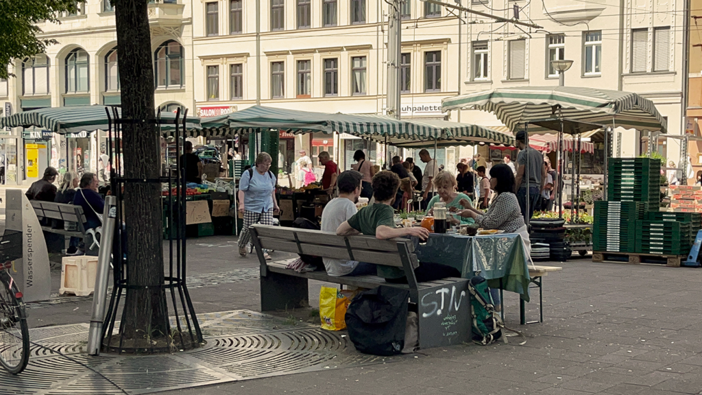 Das Plakat bildet eine vorher stattfindende Aktion am Lindenauer Markt ab, die das Thema „Zusammenkommen am Tisch“ behandelt.