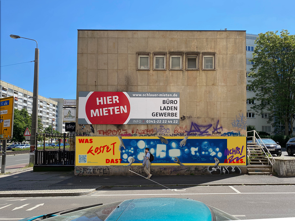 Was kostet es, eine dynamische, offene Gesellschaft zu gestalten? Eine Utopie, die uns als Gesellschaft nicht Alles, sondern Nichts abverlangt, wird abgebildet. Eine Anspielung an das Medium Plakat, was mit Werbung und Kapitalismus eng verbunden ist. Oben steht “Hier mieten”, was kostet das? Hier gibt es Kaffee und Kuchen, was kostet das?